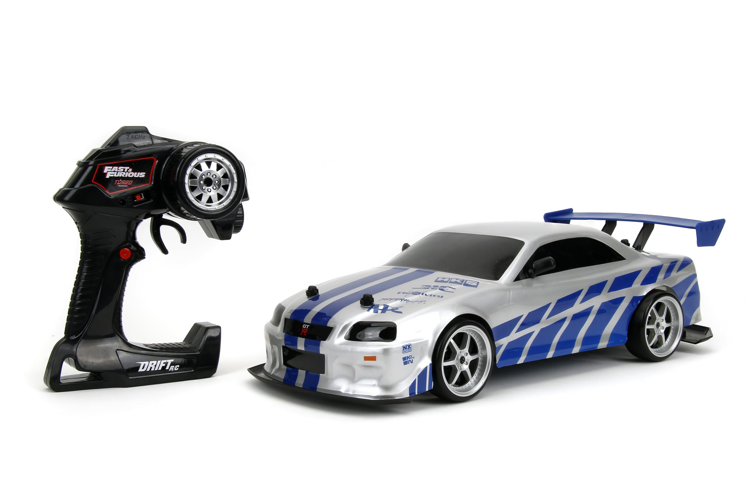 Jada Toys Fast & Furious Brian's Nissan Skyline GT-R (BN34) Drift Power Slide RC Radio Remote Control Toy Race Car with Extra Tires, 1:10 Scale, Silver/Blue (99701)