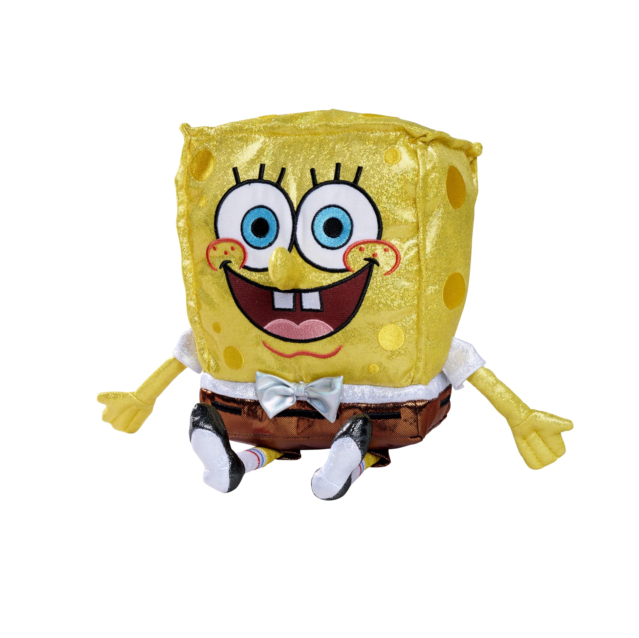 - Sparkling – For the anniversary, SpongeBob has dressed up and instead of his usual tie, he is wearing a glittery bow tie. But it’s not just the bow tie— the entire plush figure sparkles beautifully, making this plush truly something special.
